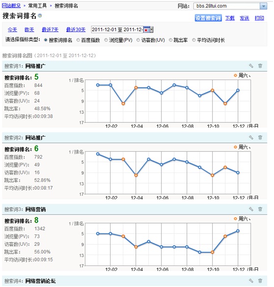 在“搜索詞排名”這個功能上,功能是非常實用的,只要使用百度統(tǒng)計,輸入搜索詞,就能管理你的網(wǎng)站每天搜索詞排名情況。下圖為搜索詞排名報告頁面的截圖,非常明了。