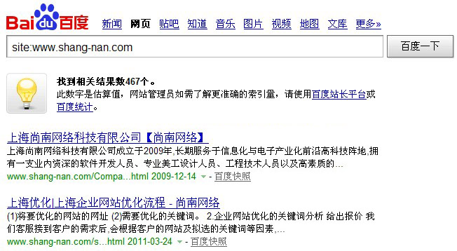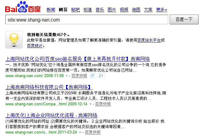 第一、首先通過site:指令來查詢網(wǎng)站收錄變化,比如說你的網(wǎng)址是www.idc0731.com,就在百度里搜索“site:www.idc0731.com”來查詢你的網(wǎng)站收錄情況,site指令查詢結(jié)果主要有以下幾種情況: